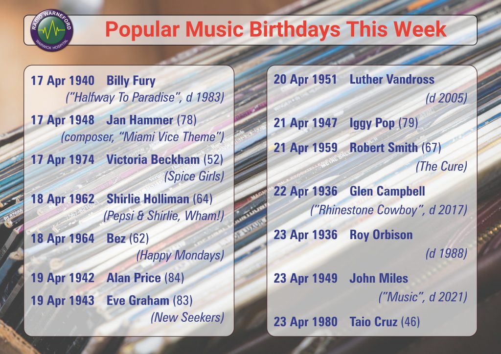 She’s “Not Such An Innocent Girl” anymore but Posh Spice is celebrating this week, she is 52 today. Wham’s Shirlie will be 64 tomorrow and Bez, from Happy Mondays, will be 62. We remember the birthdays of some musical greats this week including Glen Campbell, Luther Vandross, Billy Fury and Roy Orbison!